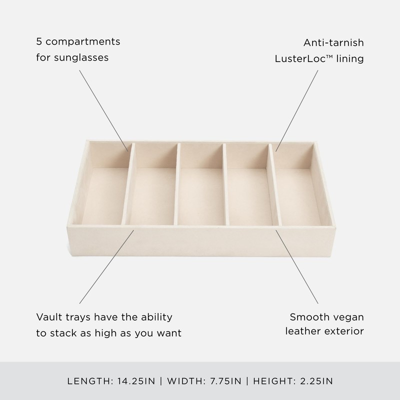 - SUNGLASS TRAY - Beautifully organize and display sunglasses with this VAULT tray insert. It fits neatly into all stackable VAULT trays and includes five compartments.