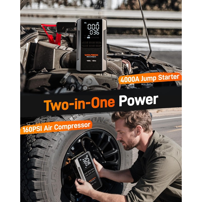 WOLFBOX 4000A Jump Starter with 160PSI Air Compressor, 12V Car Battery Booster, 65W Fast Charge, 24000mAh Portable Tire Inflator, LED Display for 10L Gas & 10L Diesel Engines, LED Light, Jumper Cables