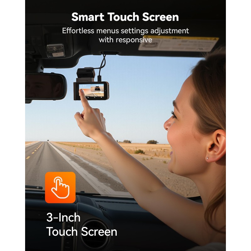 - [Smart ADAS and Touch Screen] The WOLFBOX car camera features enhanced ADAS technology that proactively alerts you to road hazards, helping prevent potential dangers while driving. Including pedestrian collision, lane departure and stop & go. Simply tap the X3 wireless dash cam's touchscreen to turn on wifi for convenient driving