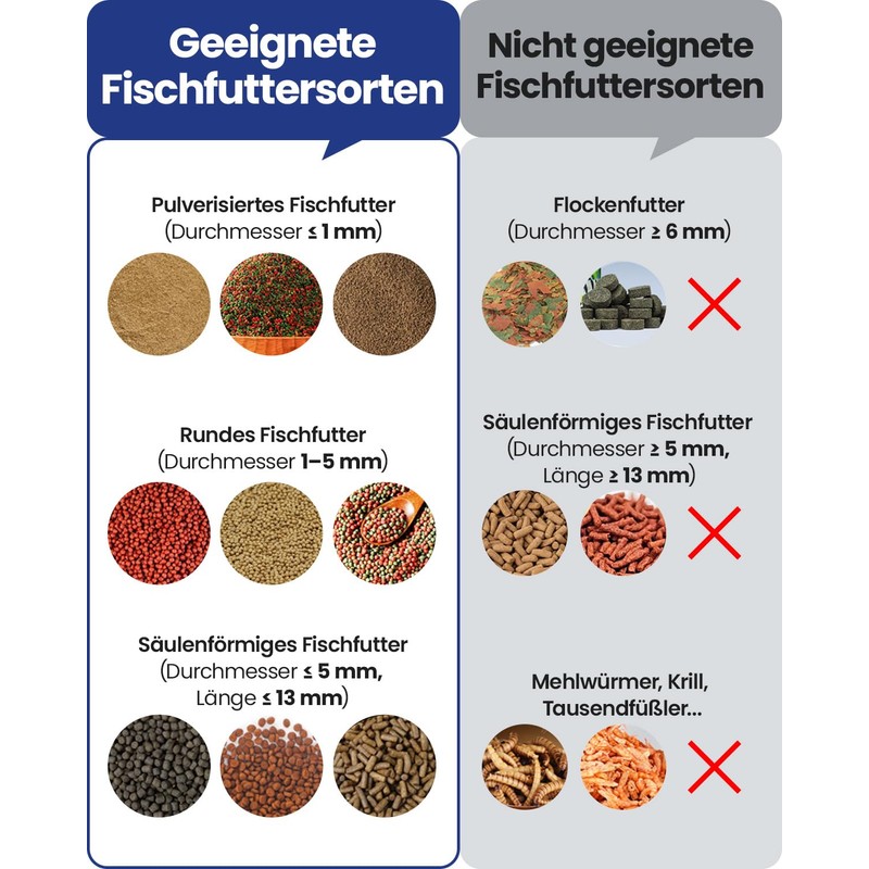 • PRECISE FEEDING WITH CUSTOMIZABLE PORTIONS This aquarium feeder is ideal for betta, goldfish, clownfish and other species. With portion control in 0.2g or 0.6g increments, it avoids overfeeding. You can schedule several small feedings per day to optimise nutrient absorption, minimise food waste and preserve water quality. Suitable for freshwater and saltwater aquariums, but not recommended for shrimp or flake food.
