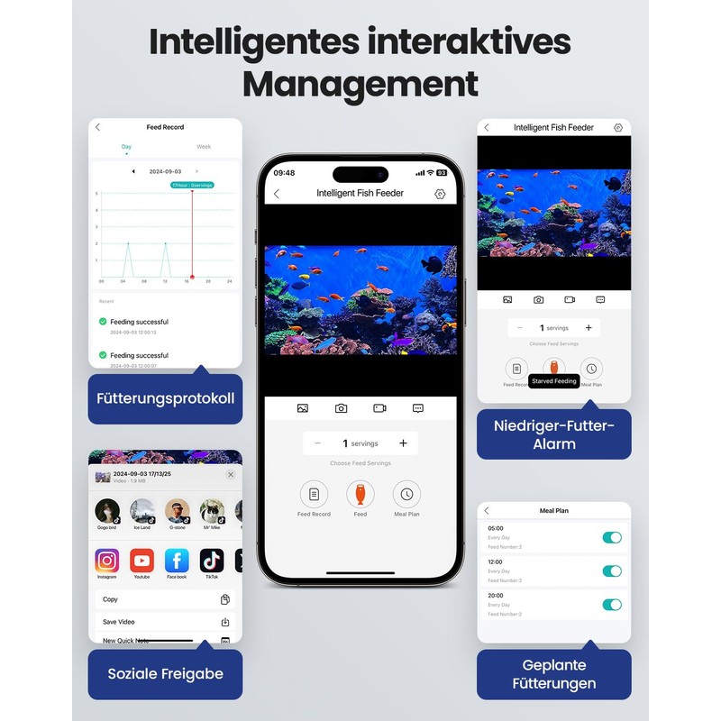 • 24/7 monitoring with HD/SD camera for aquarium feeder: This fish feeder is equipped with an HD/SD camera and night vision and allows continuous monitoring of the aquarium. Nano adhesive allows the camera to be repositioned up to 30 times to ensure optimal viewing angles of your fish. Through the app, you can take photos, record videos and share on social media - perfect for daily grooming or as a holiday solution for your automated fish feeder.