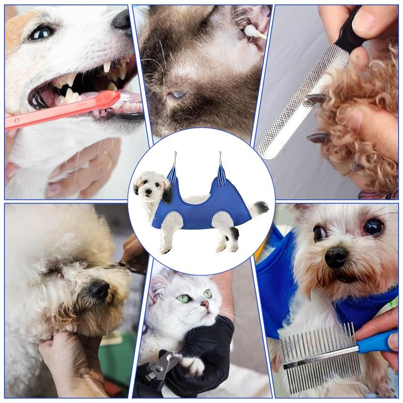 - Efficient Pet Trimming Assistant Use this dog hammock for grooming at home, you can effortlessly hold it back and you never have to struggle with your pet to cut the nails again. As an owner, you can pet care, trim nails, perform dental and ear care, and check the skin without going to an animal care series or animal hospital. A good helper for grooming. Save time and money and enjoy your life