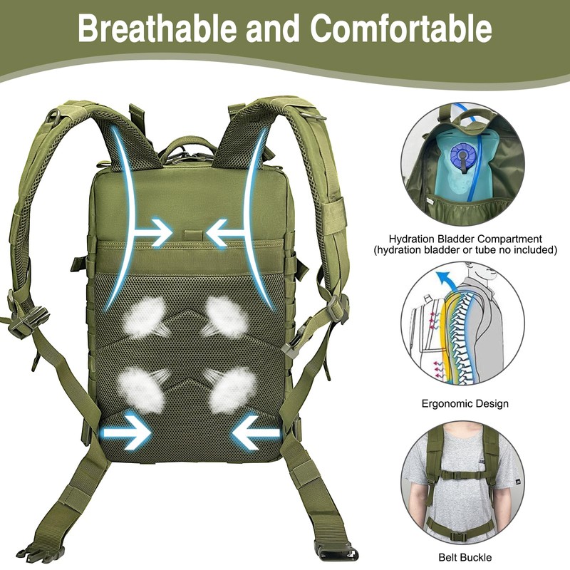 - [MULTI-FUNCTIONAL]: This military backpack is hydration-compatible, ready to accommodate a hydration bladder (not included), ideal for camping, hiking, and other outdoor activities. It can also serve as a 3-day assault pack, survival kit, army bag, bugout bag, trekking pack, range bag, or gym bag