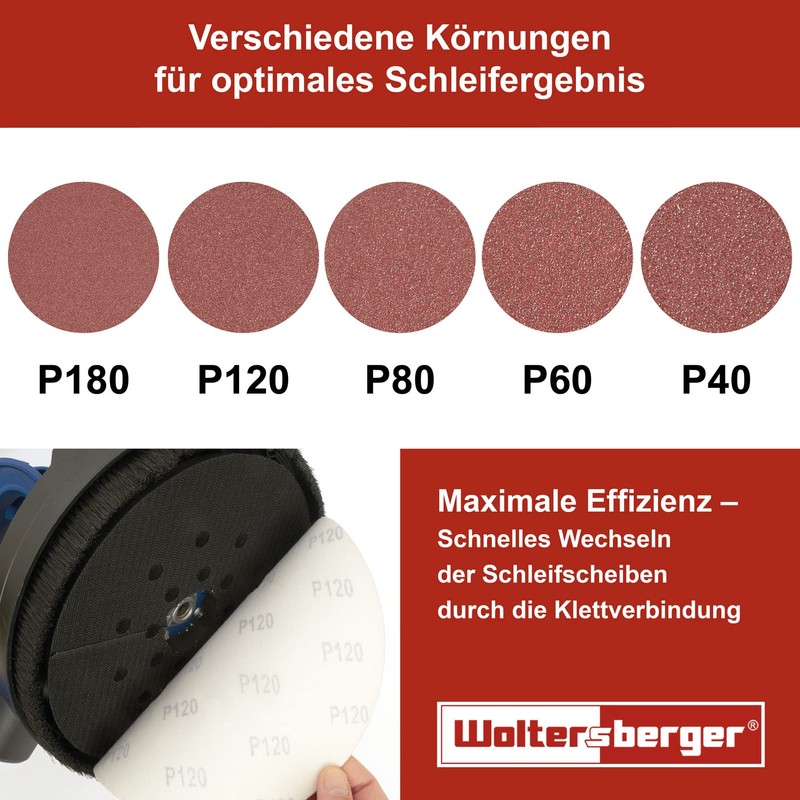 • ✅ The red Woltersberger sanding discs are available in grit P-40, P-60, P-80, P-100, P-120, P-180 and P-320. The grits of the sanding discs are printed on the back for easy identification.