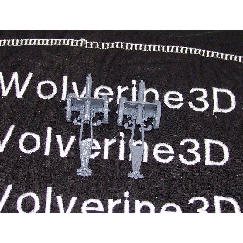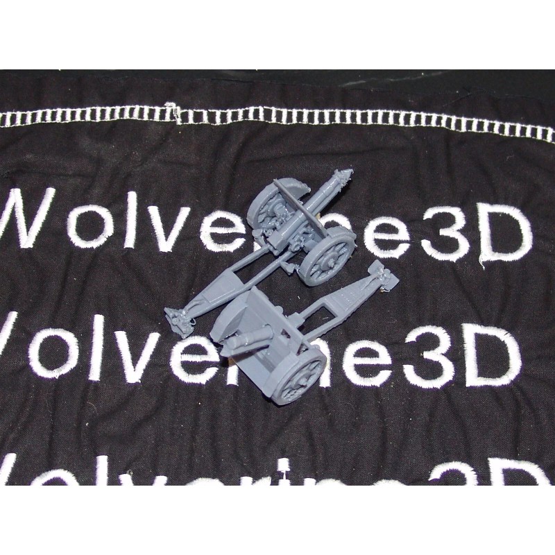 Wolverine3D: 100mm/L17 Howitzer Deployed 2 Pack 1. Made from PLA plastic. 2. The quality is good, for gaming. These were not meant to be display models. 3. On most of these there is flash to be removed before they can be painted. 4. Enamel & Acrylic paint sticks well to them. 5. CA/Epoxy and Plastic solvent work well to glue them together. 6. Colors of vehicles in photos do not guarantee actual colors. 7. Photos of any painted vehicles are for reference ONLY. 8. Free Shipping in the USA. 9. Includes one complete kit.