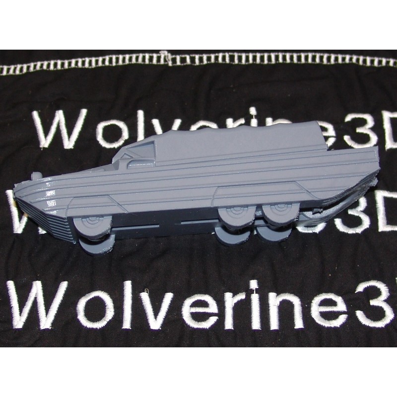 Wolverine3D: DUKW Amphibious Truck Closed 1. Made from PLA plastic. 2. The quality is good, for gaming. These were not meant to be display models. 3. On most of these there is flash to be removed before they can be painted. 4. Enamel & Acrylic paint sticks well to them. 5. CA/Epoxy and Plastic solvent work well to glue them together. 6. Colors of vehicles in photos do not guarantee actual colors. 7. Photos of any painted vehicles are for reference ONLY. 8. Free Shipping in the USA. 9. Includes one complete kit.