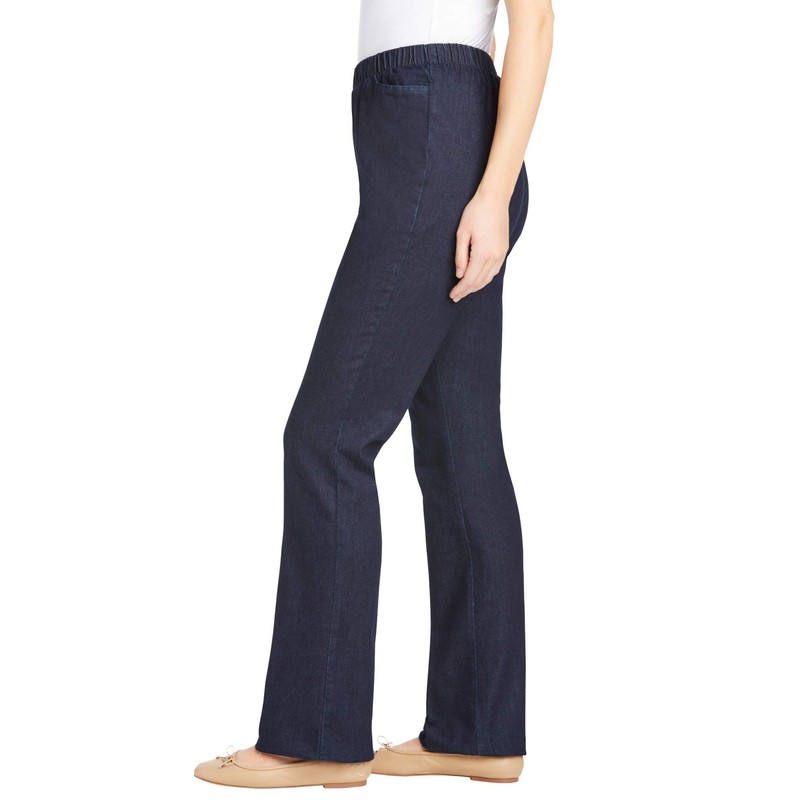 - Designed with stretch to give you the perfect fit, an all-around elastic waistband makes them even more comfortable. This pull-on style features slant pockets on the front and a pocketless back for a smooth effect. This bootcut jean has a slight flare that fits over your boots or goes great with any other shoe.