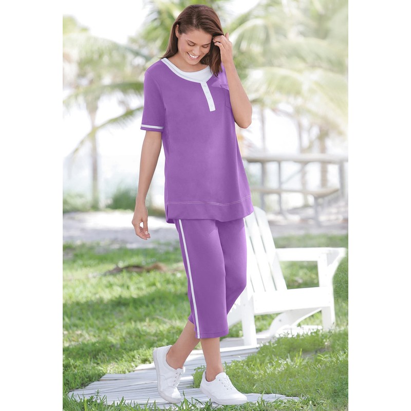 - Looking for the right matching set? Look no further! This capri set has a tee with an attached contrast inset and button placket. Easy movement throughout your day with side slits on hem. 21” length. Capris have elastic waistband to give you room. Great for those days you need to pull-on and go. Designed with contrast stripe on sides for a pretty touch.