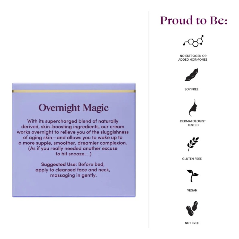 Se requiere experiencia de vida: una talla no se ajusta a todos cuando se trata de tu crema de noche antienvejecimiento, por lo que formulamos una específicamente para la mujer en progreso. Restaura y suaviza tu cutis con una crema restauradora durante la noche alimentada por ácido hialurónico y aceite de bakuchiol.; Crema facial de noche ultra eficaz: esta crema hidratante facial está repleta de HyaClear 7, una combinación superior de siete tipos de hialuronato de sodio (una forma de ácido hialurónico), que optimiza la humedad, la elasticidad y la firmeza, preservando la juventud de tu piel desde adentro hacia afuera.; Alternativa más suave al retinol: una crema de noche facial diseñada para mujeres que buscan soluciones sobre cómo vivir bien en cualquier etapa de la vida. Se ha demostrado que la potente alternativa de retinol bakuchiol derivado de plantas le da los beneficios del retinol - el reafirmante y el brillo, el abordaje de líneas finas y arrugas - sin las desventajas, como la piel irritada, escamosa o roja o sensibilidad extra al sol.; Lujo y ligero: esta crema hidratante facial nocturna no grasa se seca muy rápido y se siente absolutamente hermosa en tu piel. Aplica tu crema hidratante de noche antes de acostarte.; Mujercita. El arte de envejecer bien. Nuestra crema hidratante vegana Overnight Magic está hecha sin estrógenos, fitoestrógenos u hormonas añadidas. Libre de ingredientes derivados de animales, parabenos, ftalatos, sulfatos, colores artificiales, formaldehído y aceites minerales, esta crema de noche antiarrugas es ideal para todo tipo de piel. Todos nuestros productos estan en inglés SKU 100625097505