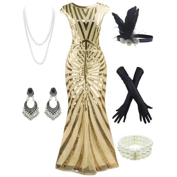 Women 1920S Gatsby Sequin Mermaid Formal Evening Dress with 20s Accessories Costume (M, Beige)