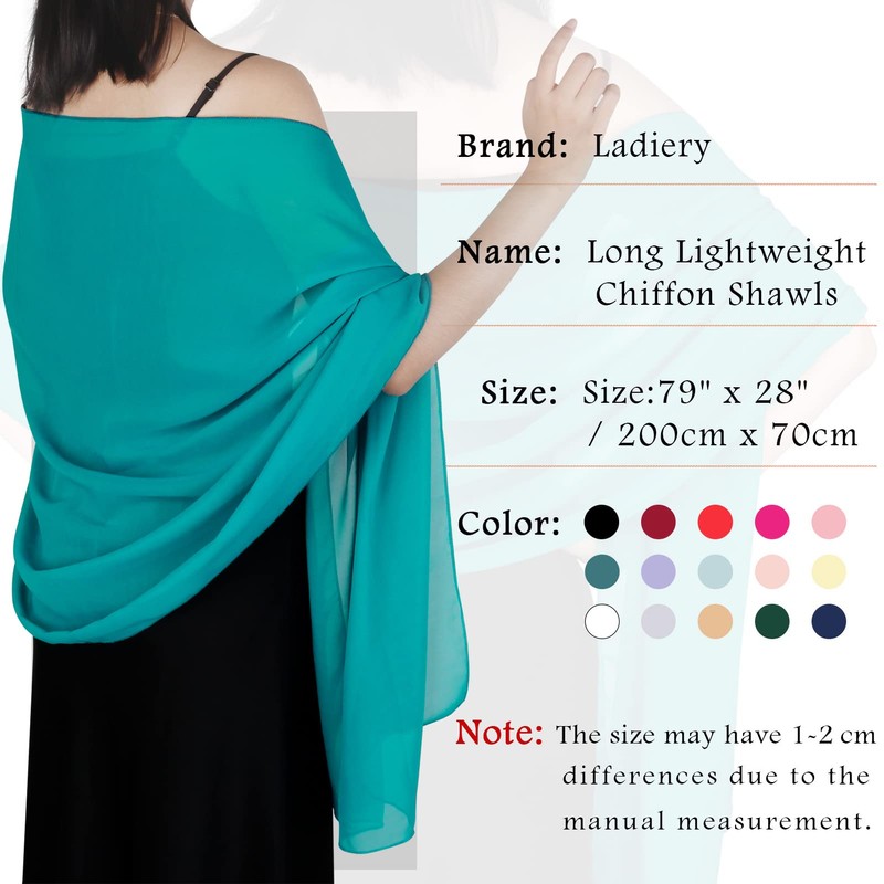 - SUITABLE SIZE: These trendy chiffon shawls can match with different style clothes. Chiffon Shawl size: 79" x 28" / 200 cm x 70 cm. This chiffon's size will long enough to fit outfit, dress, gown, blouse, jacket, bikini and shirt etc. You will be stand out from the crowd with much charm. One size fits most women.