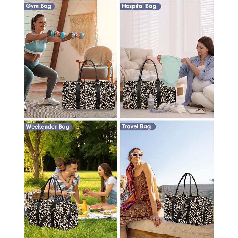 - FREE TOILETRY BAG + SEPARATED WET AND DRY GYM BAG HOSPITAL BAG - The carry on duffel bag comes with 1 toiletry bag to store your cosmetics/toiletries. Also overnight bags for women have a waterproof PVC lined pocket that separates wet and dry items like clothes, towels and swimsuits. Brown Leopard duffel bag is the perfect companion for outdoor and indoor sports like workouts, yoga, camping, beach etc. If you're a novice mother, it can also be used as a mom hospital bag, maternity bag or diaper bag.