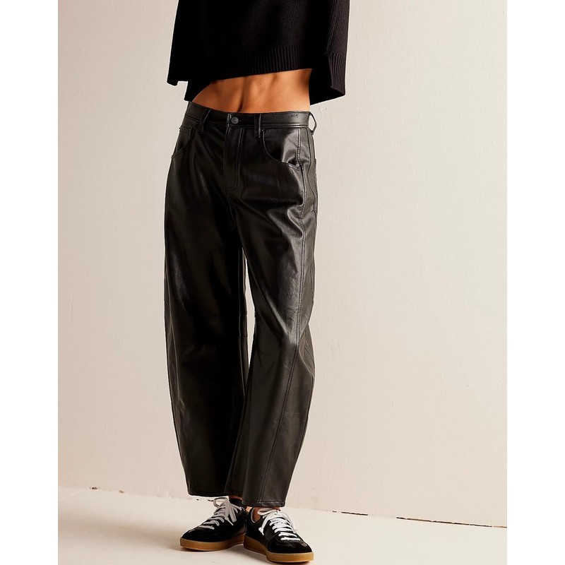 - Style:Wide leg faux leather pants,women black PU leather jeans,Mid waist long trousers,casual maxi straight leg buttom pant,retro wide leg pants,Baggy barrel jeans