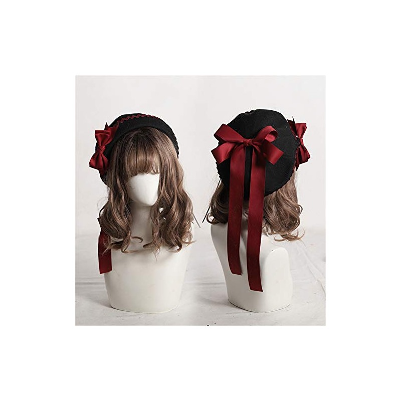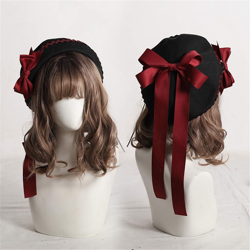 Women Girl's Lolita Painter Hat Beret Cap with Bowknot (Black Red)