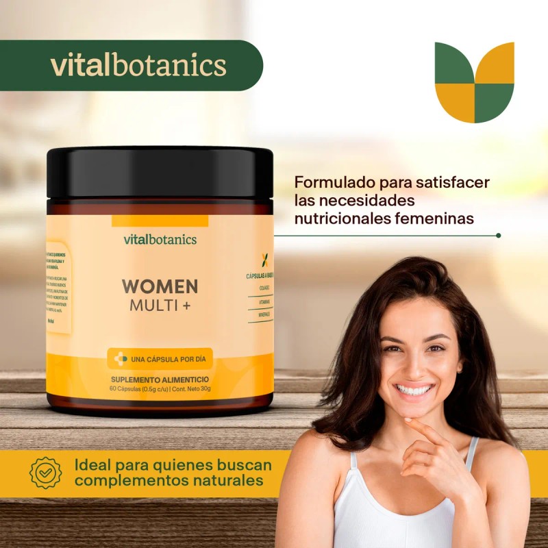 🌟 ⭐ WOMEN MULTI + Multivitamínico de 60 cápsulas 500mg con Ácido Fólico, Biotina, Complejo B, Vitamina D, K, Calcio, Hierro, Magnesio, Zinc, Colágeno Hidrolizado y Moringa. Suplemento VitalBotanics ⭐ 🌟
