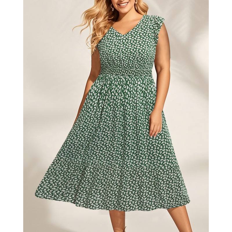 Women Plus Size Summer Floral Boho Midi Casual Rayon Bohemian Pockets Dress 2024 Ruffle Sleeves V Neck Spring Sundresses