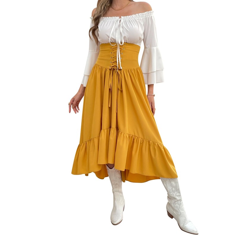 Women Renaissance Costume Medieval Victorian Fancy Dresses High Waisted Lace-up Skirt Set(S,Yellow)