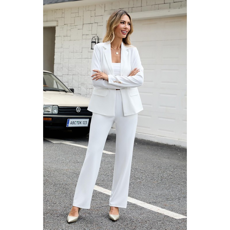 Women's 2 Piece Suits Business Casual Outfits Long Sleeve Solid Blazer with Pants Professional Office Work Sets White