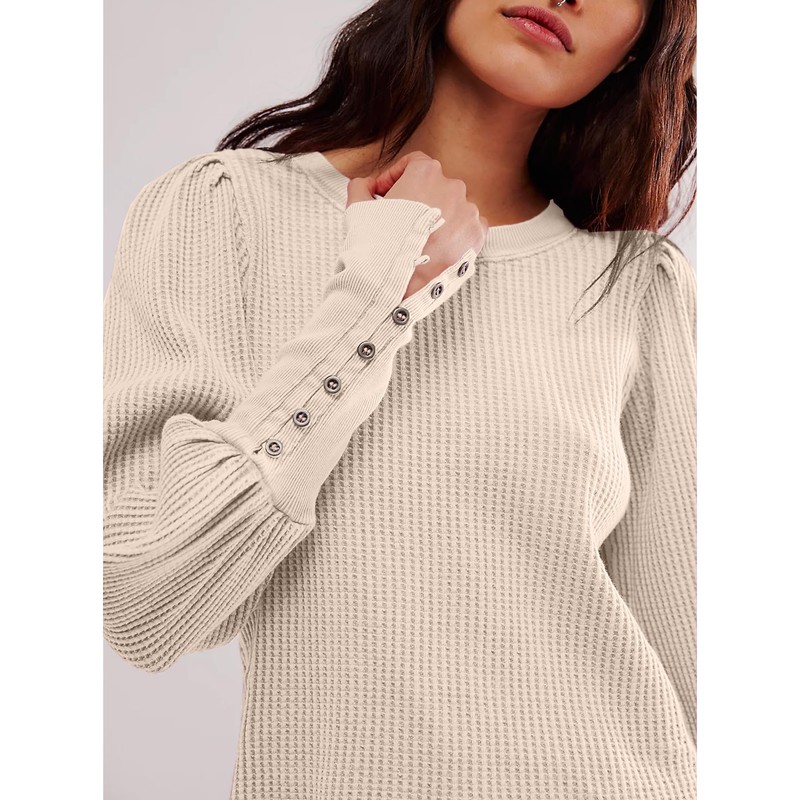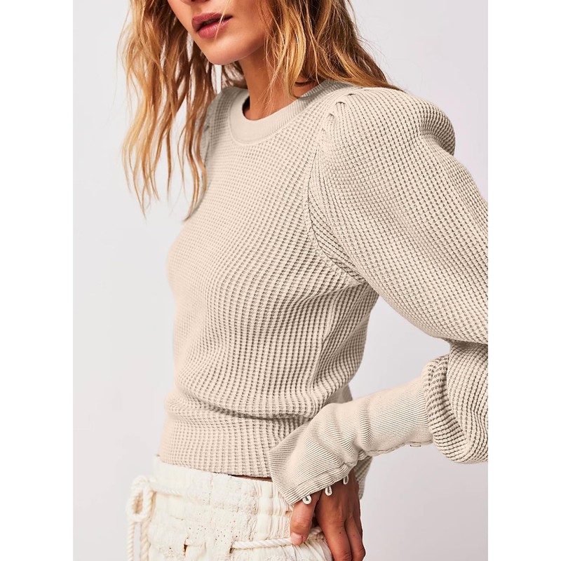 Women's 2024 Fall Puff Long Sleeve Crew Neck Sweatshirt Pullover Waffle Knit Casual Winter Thermal Tops(Ivory,S)