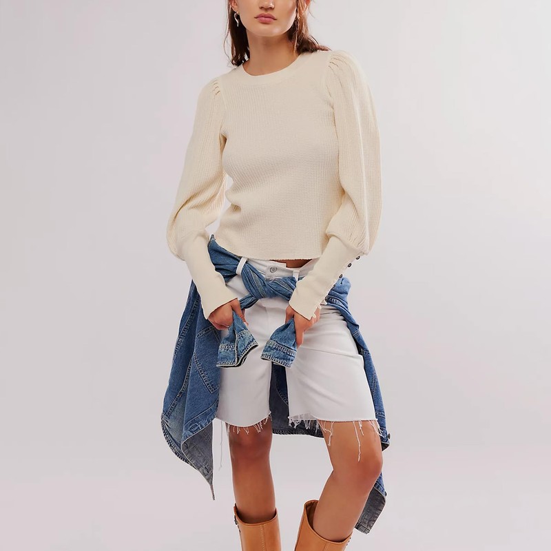 - Features: Long puff sleeves, a scoop neckline, pleating at shoulders, defined sleeve cuffs, pullover sweatshirt, relaxed fit, hits at hip, tighten the cuffs, waffle knit, soft fabric and cut in an easy, flattering silhouette