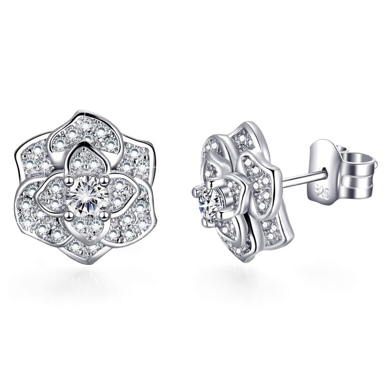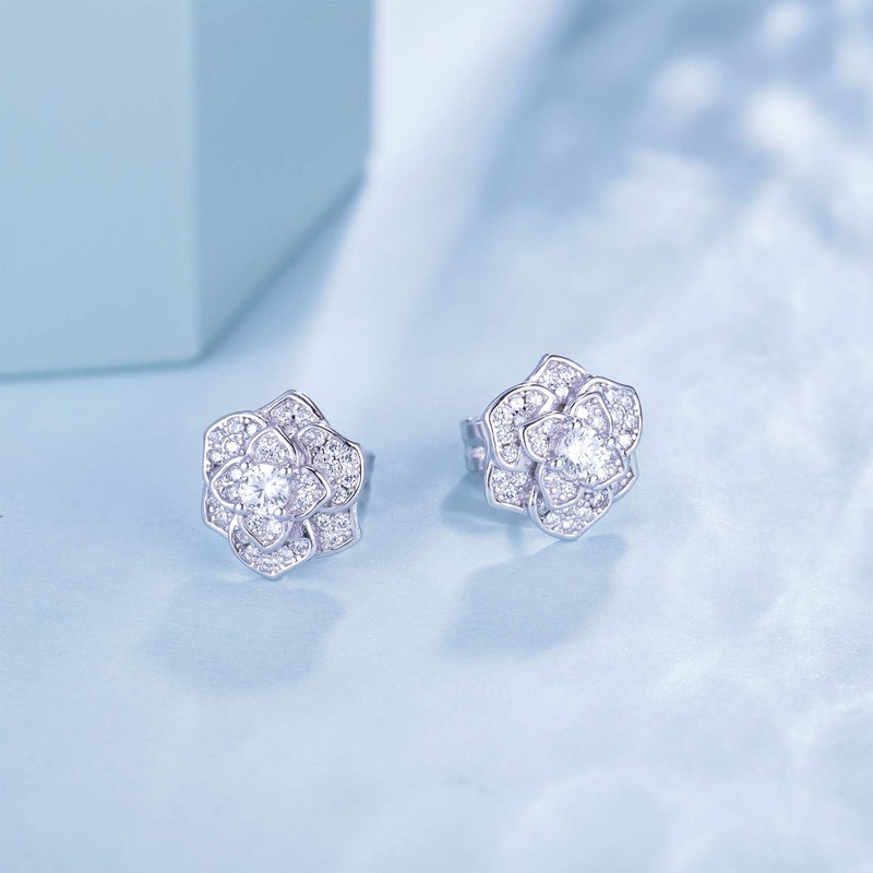 Women's 925 Sterling Silver Love Rose Flower Stud Earrings White Gold-Plated CZ Diamond Earrings Stud Earrings for Women Girls, Silver, Cubic Zirconia