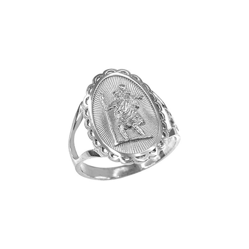 Available in nothing less than authentic 925 sterling silver, this religious ring shows St. Christopher, the patron saint of all travelers, carrying Jesus Christ as a child.