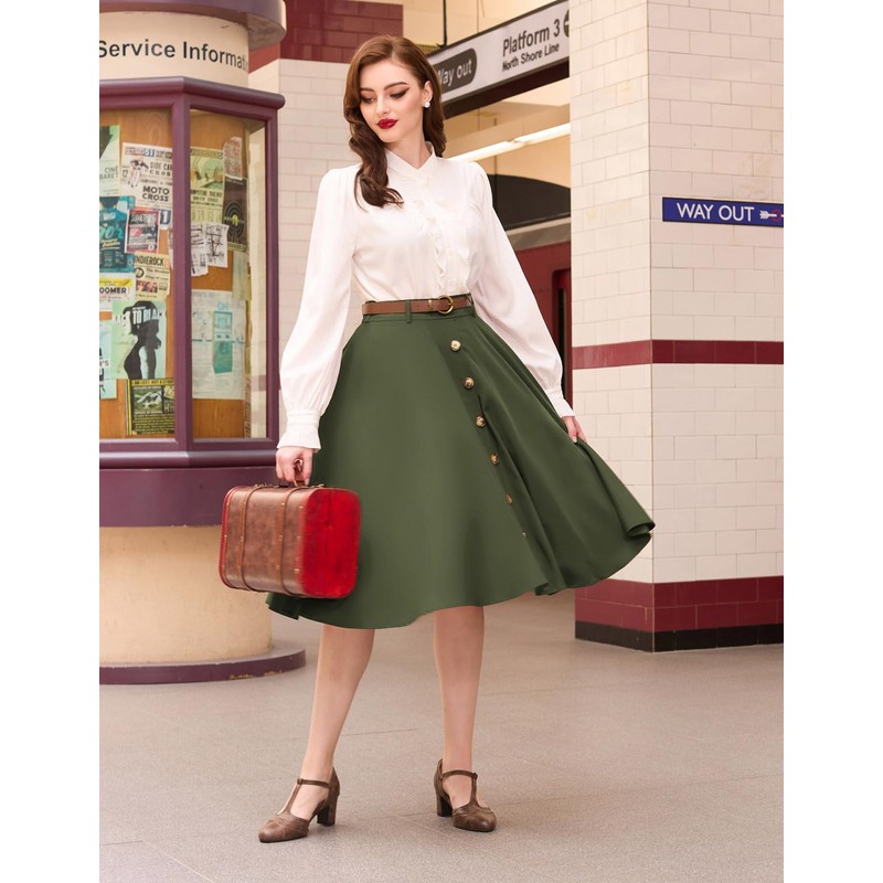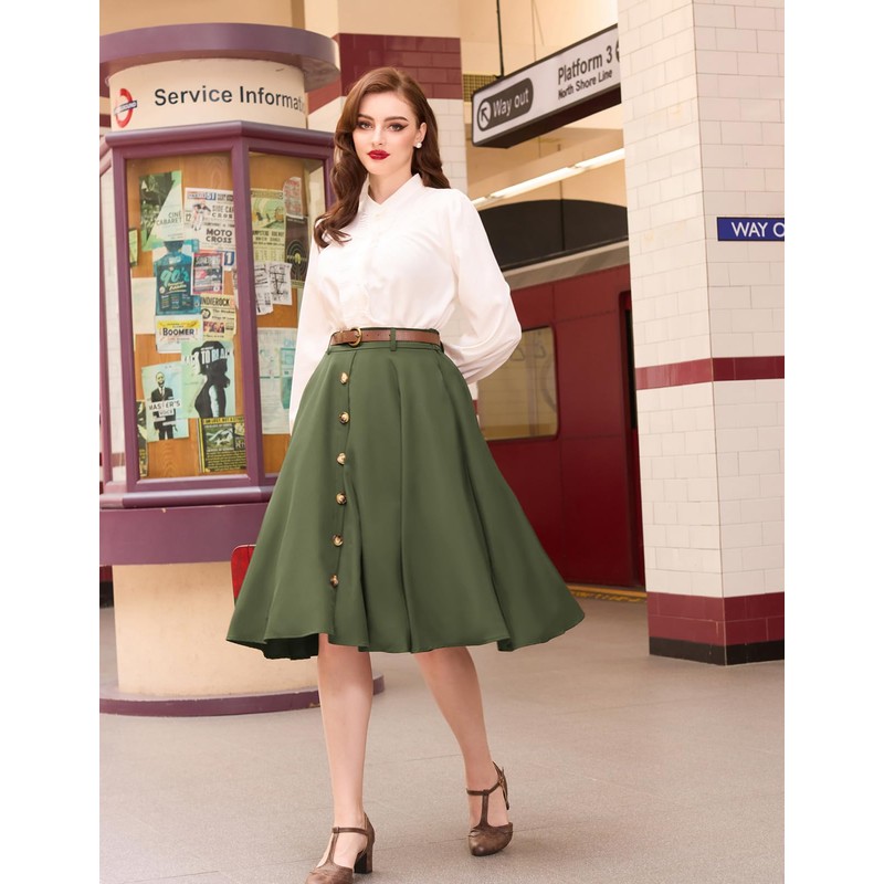 - Retro Design: Vintage Skirt Features seven decorated buttons in the front, detachable belt,midi length and pockets, you can put small things like mobile phone, keys into it, high waisted, a-line design, classic solid color