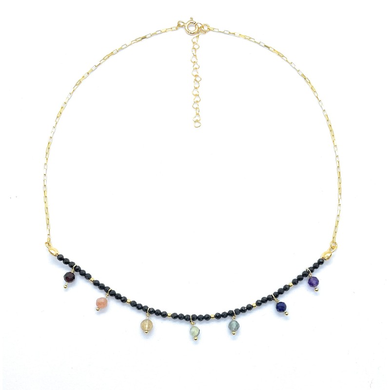 Women's choker 7 chakras natural stone black spinel 925 sterling silver gold plated 3 microns length of 40cm expandible to 45 cm