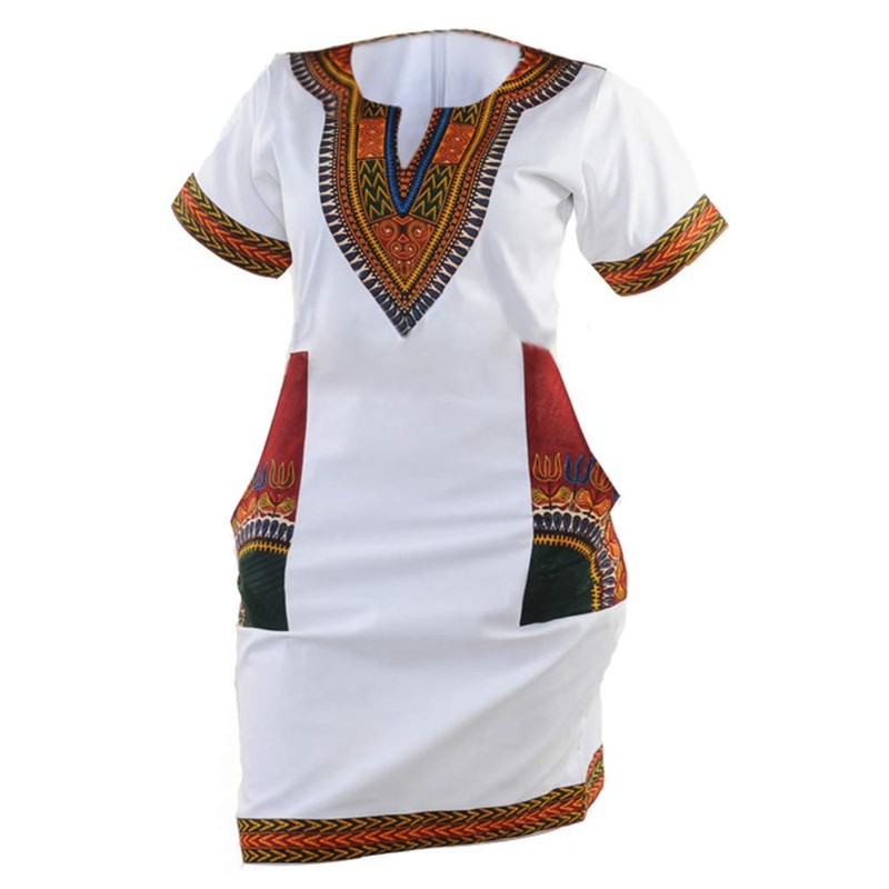 Women's Dashiki African Tribal Bohemian Dresses Short Sleeve Knee Length Skirt with Pockets White/Red