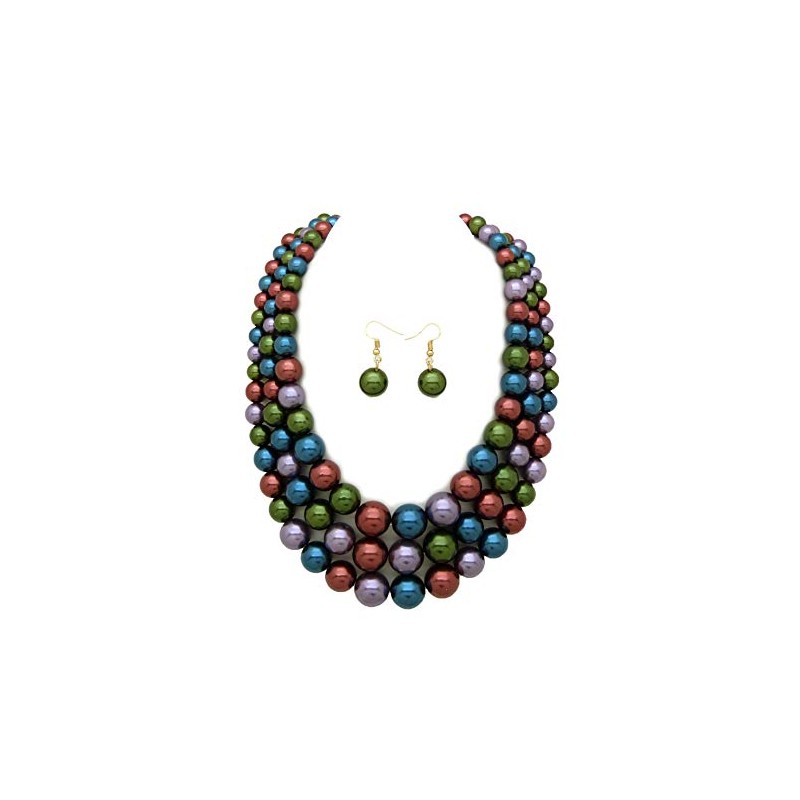Women's Faux Pearl Three Multi-Strand Statement Necklace and Earrings Set (Dark Multi)