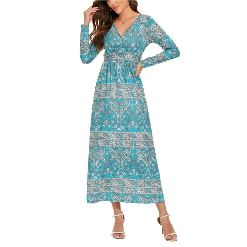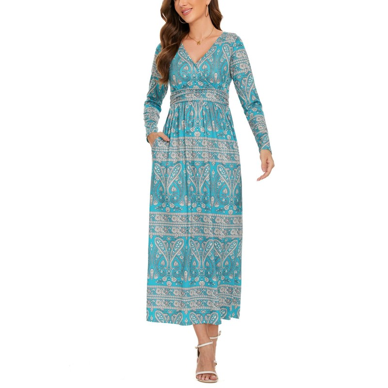 Women's Long Sleeve Floral Pattern Boho Style V-Neck Maxi Dresses with Pockets A-line Print Maxi Dress Casual Cocktail Dress Fitted Summer Dress Elegant, Style 2