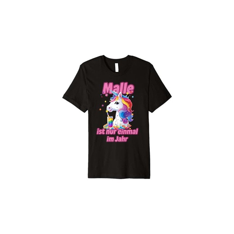 - Women's party top with saying: Malle ist nur einmal im Jahr und die nächste Party steht an. Modern cool trend motif clothing for women with print and tiny sayings. Our rainbow unicorn with colourful mane and cocktails design.