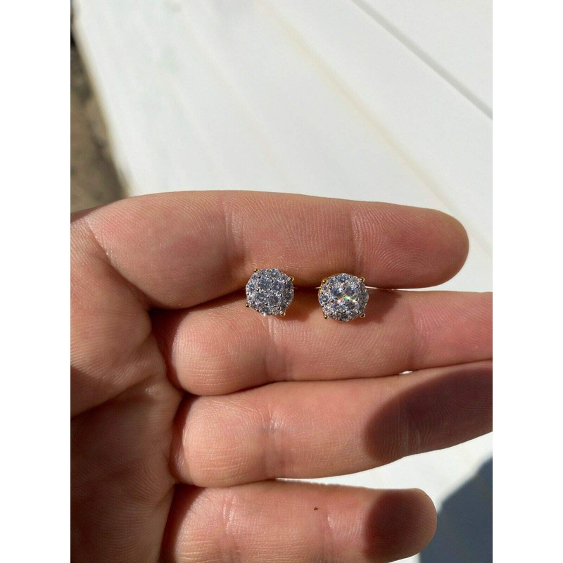 Women's & Real Solid 925 Silver Iced CZ Hip Hop Mens Earrings Round Studs 14k Gold Finish