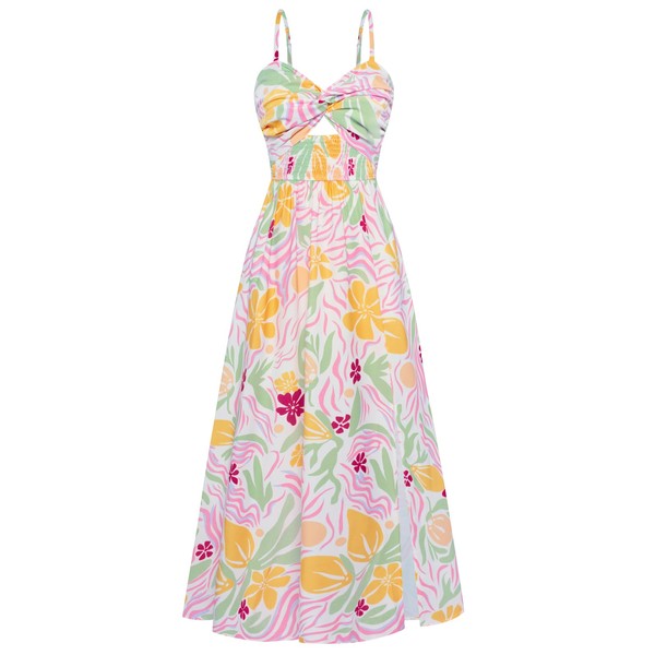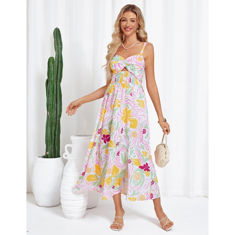 Women's Summer Boho Beach Maxi Dress Spaghetti Strap Floral Sundress with Twist Knot Front Smocked Back Split White Yellow Floral S