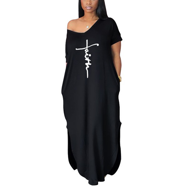 Women's Summer Casual Long Dress Faith Print V NeckTshirt Loose Side Split Beach Maxi Dresses with Pocket