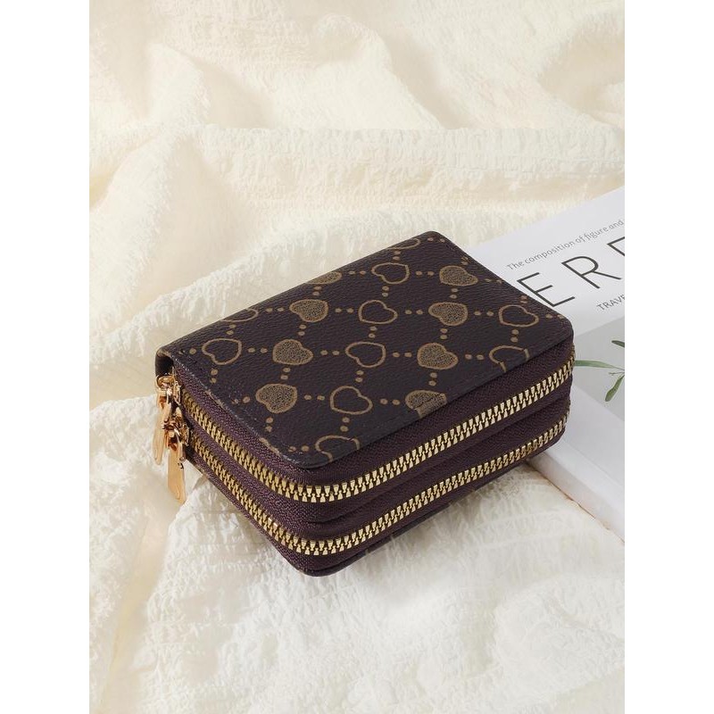 Women's Summer Retro Heart Print Double Zipper Around Coin Purse, Simple Multi-card Card Holder, Pu Leather Credit Card Wallet Storage Bag for Outdoors & Travel, Fall Outfits, Earthtone Fall Freshness:_Green_Please Refer To The Pictures for Dimensions