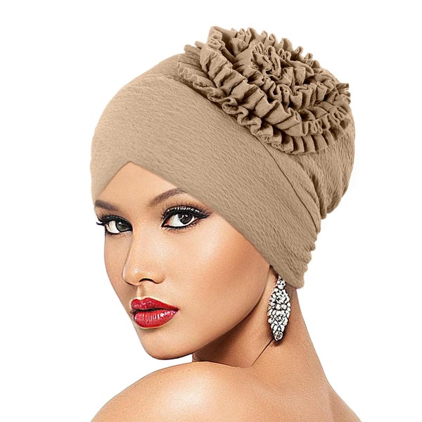 Women’s Turban Hat with Flower – Soft Elastic Head Wrap Cap for Chemo Sleep Muslim Head Cover Elegant Cross Front Beanie Khaki