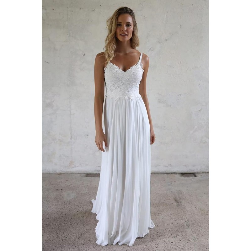 - This A-line v neck chiffon beach wedding dress, lace appliques chiffon wedding dress, spaghetti straps, v neck and waist design highlight the bride's figure. Romantic lace appliques, elegant chiffon skirt, and sexy backless design create a beautiful and romantic dream wedding dress, allowing the bride to release her unique feminine charm!