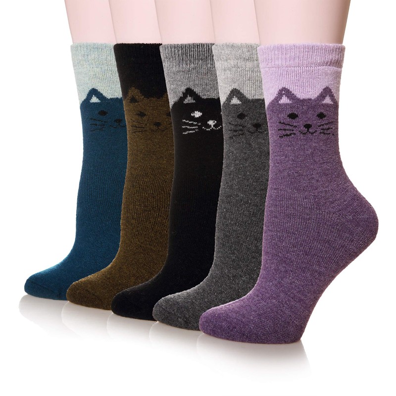 Women Soft Thick Socks Cute Animal Casual Comfort Warm Crew Wool Winter Socks - 5 Pack (Cat)