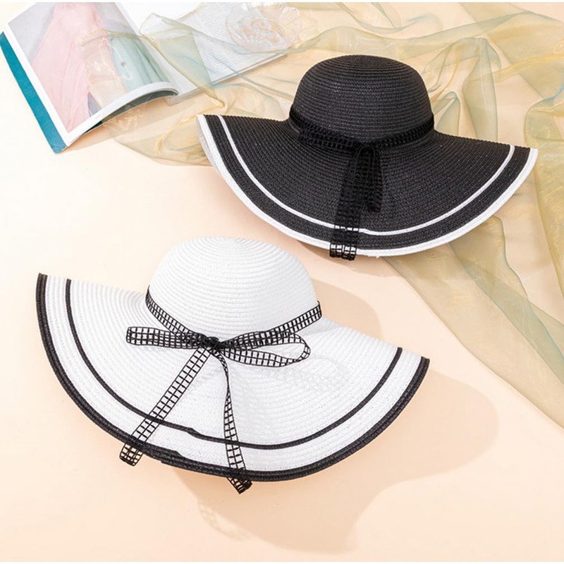 Women Striped Bow Wide Brim Oversized Sun Visor Summer Beach Hat Floppy Hat Foldable Roll Up Summer Hat (Black), White, One Size, White, Unit size