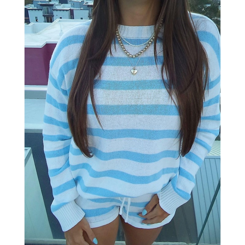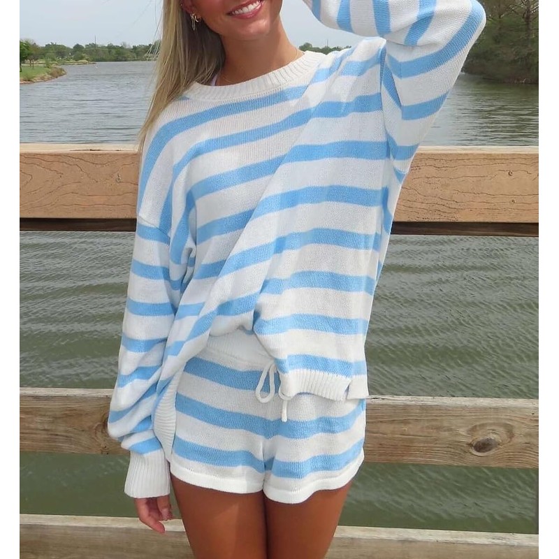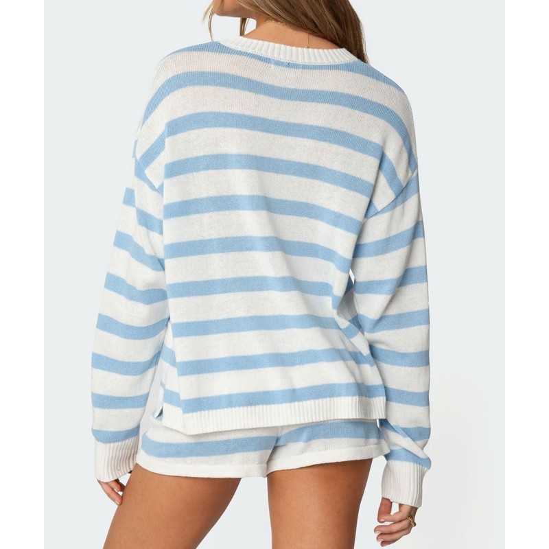 - Features: Women oversized knitted sweater set, long sleeve crew neck sweater, striped printed, casual loose fit, lightweight knit fabric, drawstring waist shorts, hollow out, y2k matching outfits set, summer 2 piece shorts set, lounge set for women, matching sleepwear, knit set.