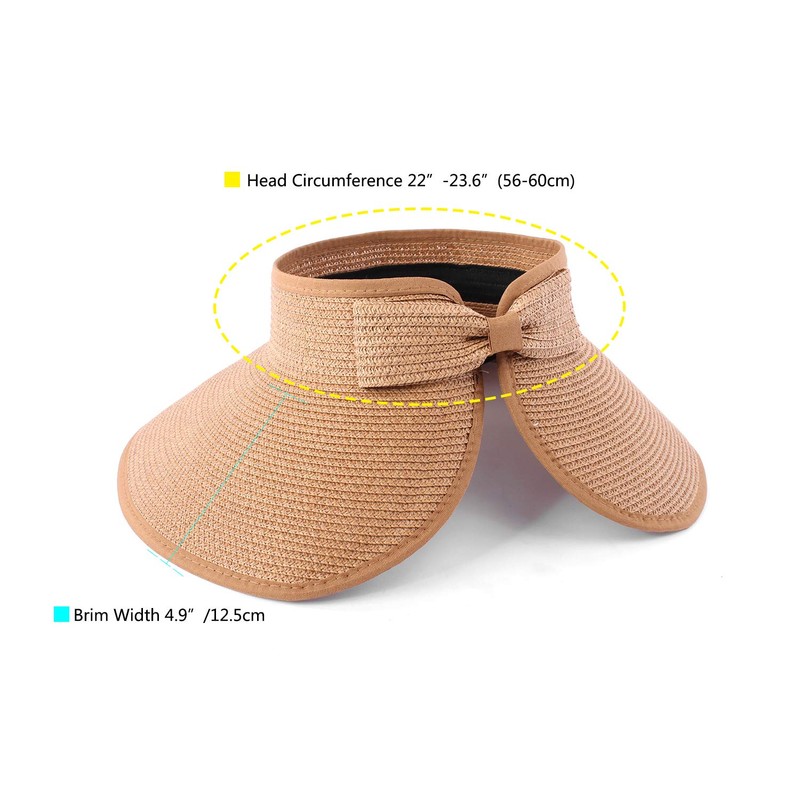 Women Sun Visors Foldable Straw Hats Summer Beach Packable Hat Floppy Wide Brim Cap Big Heads Sombrero (Khaki)