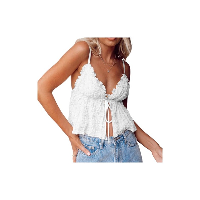 - Design: This trendy Y2K tank top features adjustable spaghetti straps and a sexy tie-front closure that lets you adjust for a perfect fit. The playful ruffled trim adds flirty movement, making this a must-have for summer going out.