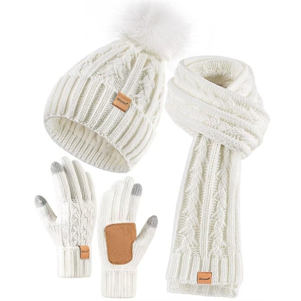 Womens Beanie Hat Scarf Gloves Set, Soft Fleece Lined Winter Hat with Pom Pom, Long Knit Scarf Neck Warmer Touchscreen Gloves for Cold Weather, 3 in 1 Warm Set (White)