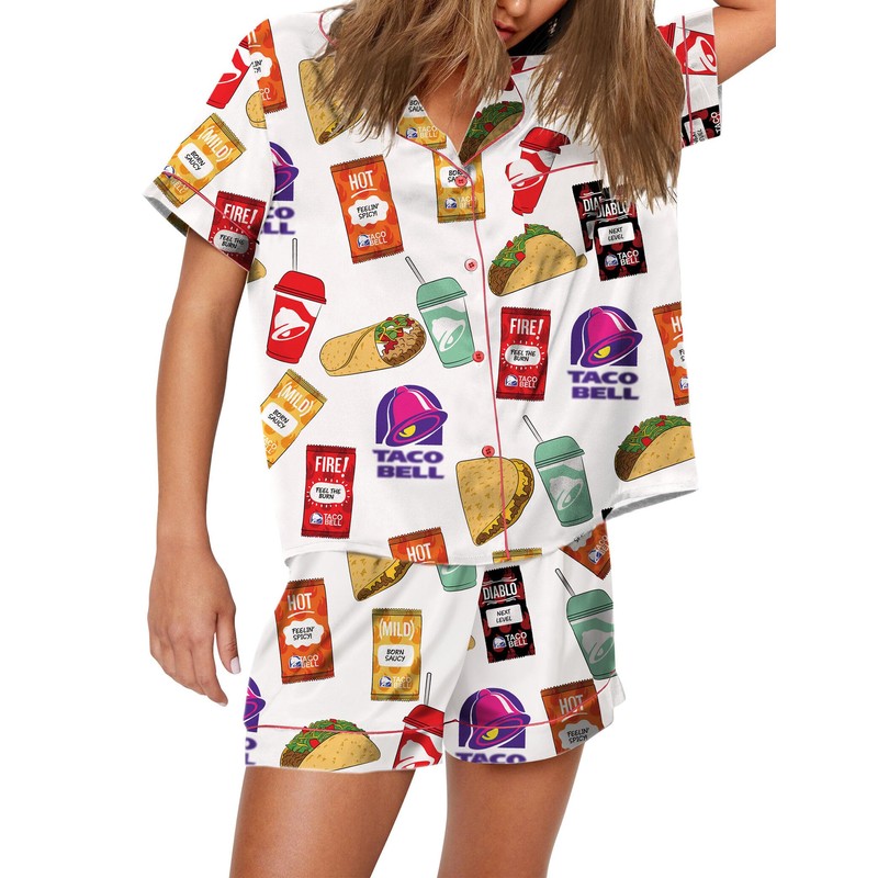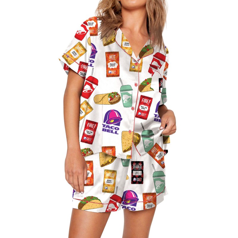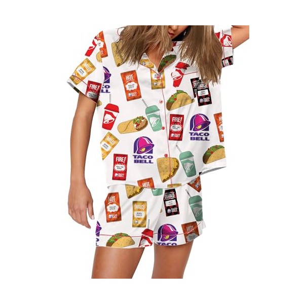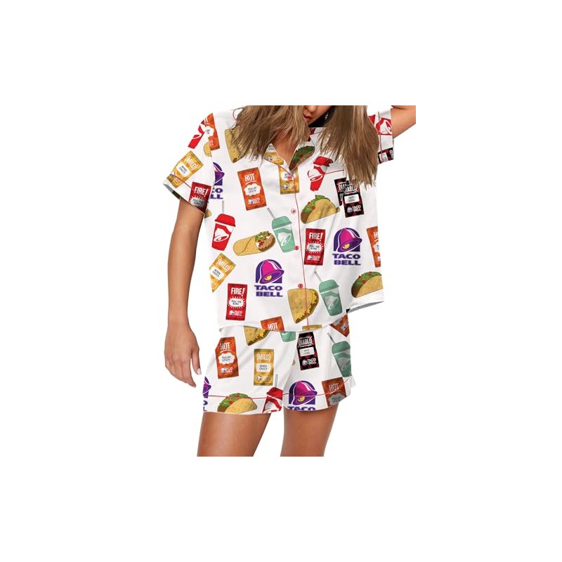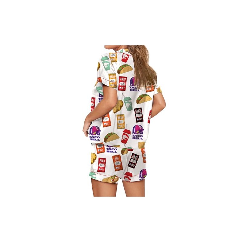 Womens Button Down Pajama Sets Soft Button Down Loungewear 2 Piece Outfits Cute Pj Sets Taco Food Print White M