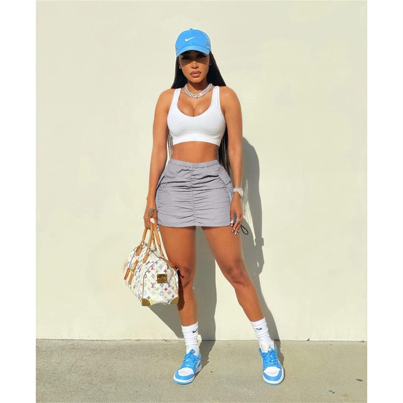 Womens Cargo Skirt Y2K - Casual Summer High Waisted Bodycon Pencil Ruched Mini Skirts Side Drawstring and Pockets Gray M