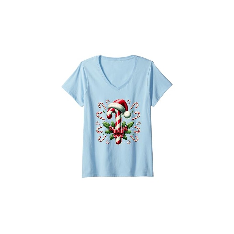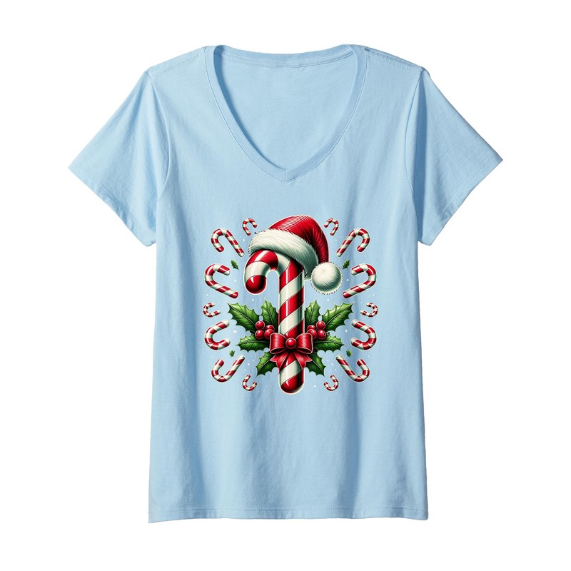 Womens Christmas Candy Cane Crew Lights Red and White Candy Costume V-Neck T-Shirt