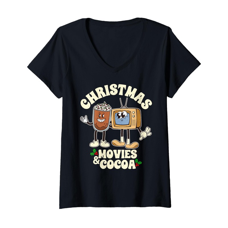 Womens Christmas Movies and Cocoa Festive Xmas Holiday Winter Vibe V-Neck T-Shirt