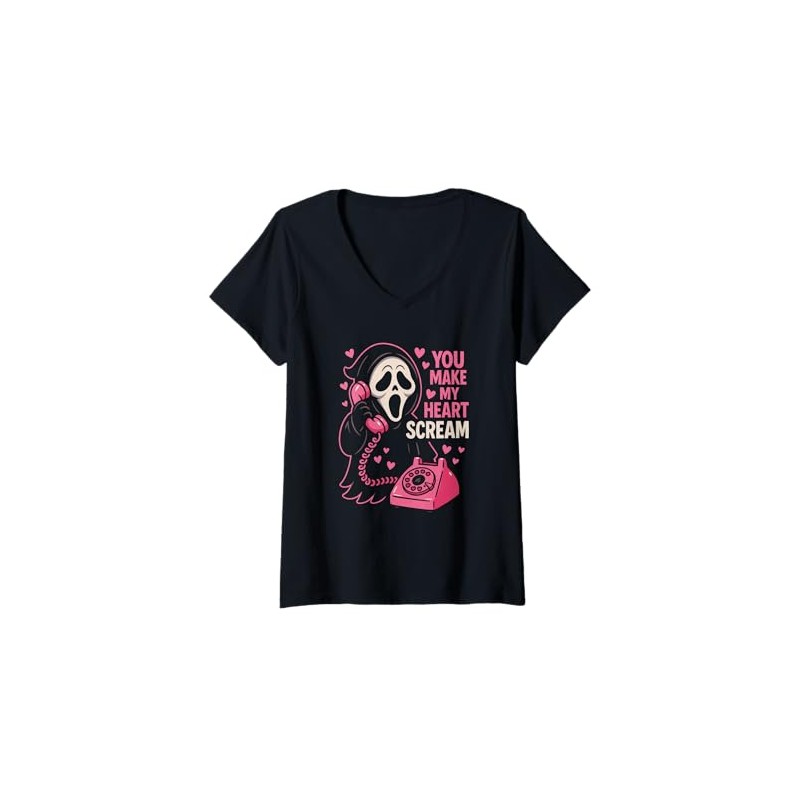 Womens Cute Creepy Horror Make My Heart Scream Valentine’s Day V-Neck T-Shirt