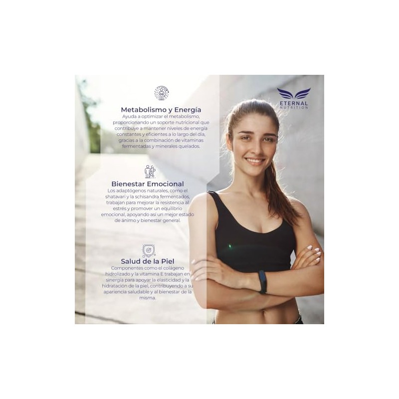 - Acerca de este artículo 💎 Calidad Premium: En Eternal Nutrition, nos enorgullece ofrecer productos premium de alta calidad, nos comprometemos a proporcionar pureza y excelencia en cada ingrediente utilizado y garantizamos la calidad probando cada producto en laboratorios acreditados. 💰 Mas por tu dinero: Somos una marca justa, nos esforzamos para fabricar los mejores productos a precios justos, no tenemos intermediarios, evitamos gastos adicionales y lo que mas nos importa es tu bienestar. 💊 Vitaminas de formas elevadas con alta absorción: La inclusión de vitaminas en formas bioactivas y altamente absorbibles asegura que los nutrientes esenciales sean directamente disponibles para las células, lo que es crucial para optimizar las funciones celulares, desde la producción de energía hasta la reparación y regeneración celular. Esto sustenta directamente el rendimiento físico y mental, al asegurar que las células trabajen de manera eficiente y efectiva. 🪨 Minerales quelados: La quelación mejora la biodisponibilidad de los minerales, facilitando su absorción y utilización por parte del cuerpo. Los minerales son cofactores esenciales en numerosas reacciones enzimáticas a nivel celular que apoyan el metabolismo energético, la salud ósea, y la función muscular y nerviosa, fundamentales para mantener la potencia y el rendimiento. 🍃 Extractos de plantas y adaptogenos fermentados: La fermentación no solo mejora la biodisponibilidad de los nutrientes sino que también produce metabolitos secundarios beneficiosos, como ácidos orgánicos, peptidos, y antioxidantes, que pueden proteger las células del daño oxidativo y apoyar la salud inmunológica y digestiva, contribuyendo a un rendimiento óptimo a nivel celular. 🌺 Fortalecimiento y Belleza de Piel y Cabello: La inclusión de colágeno hidrolizado, ácidos grasos Omega